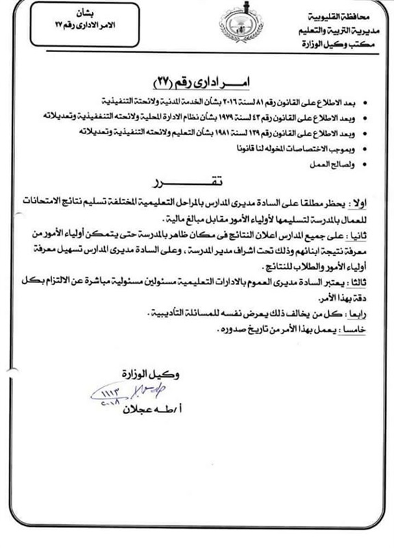 1- يحظر مطلقاً علي مديري المدارس بالمراحل التعليمية المختلفة تسليم نتائج الامتحانات للعمال بالمدرسة لتسليمها لآولياء الآمور مقابل مبالغ مالية.