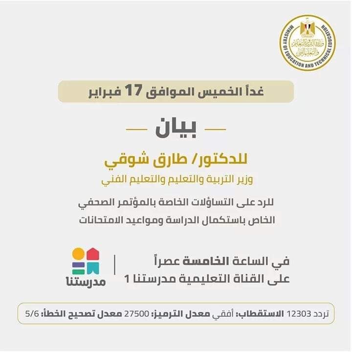 يعلن الدكتور طارق شوقي وزير التربية والتعليم والتعليم، غداً الخميس الموافق 18 فبراير، بيان صحفي، الساعة الخامسة عصراً علي القناة التعليمية مدرستا ١.
