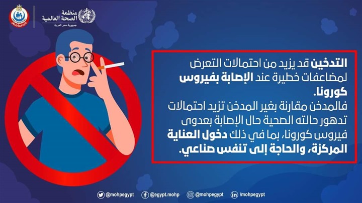 فأشارت وزارة الصحة، إلى أن المدخن لمقارنة بغير المدخن تزيد احتمالات تدهور حالته الصحية حال الإصابة بعدوى فيروس كورونا.