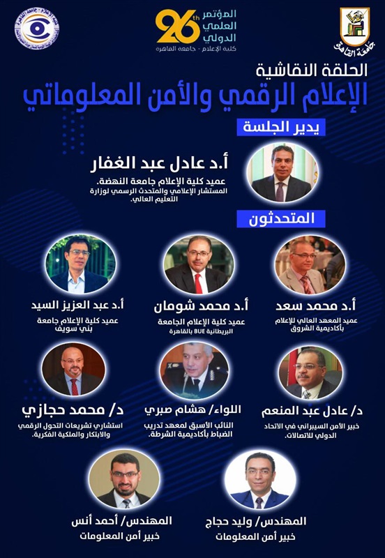 تستضيف كلية الإعلام جامعة القاهرة حلقة نقاشية بعنوان: " الإعلام الرقمي والأمن المعلوماتي"، وذلك ضمن فعاليات مؤتمرها العلمي السادس والعشرين المقرر عقده يومي 24 و25 مارس المقبل.