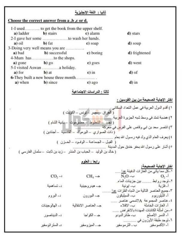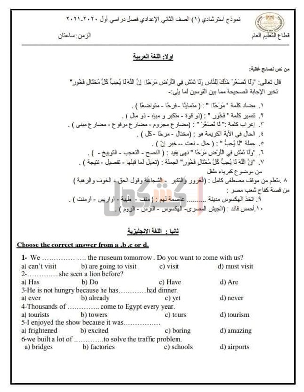 نموذج استرشادي لامتحانات الصف الثاني الاعدادي