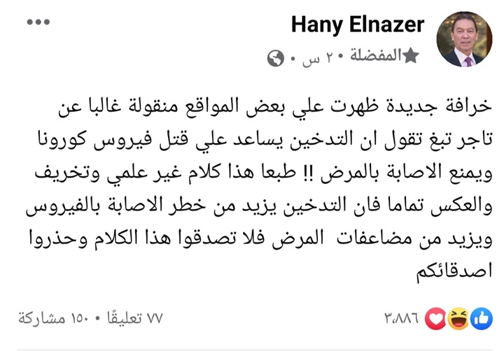 فتابع الدكتور هاني الناظر: " فان التدخين يزيد من خطر الإصابة بالفيروس ويزيد من مضاعفات المرض فلا تصدقوا هذا الكلام".