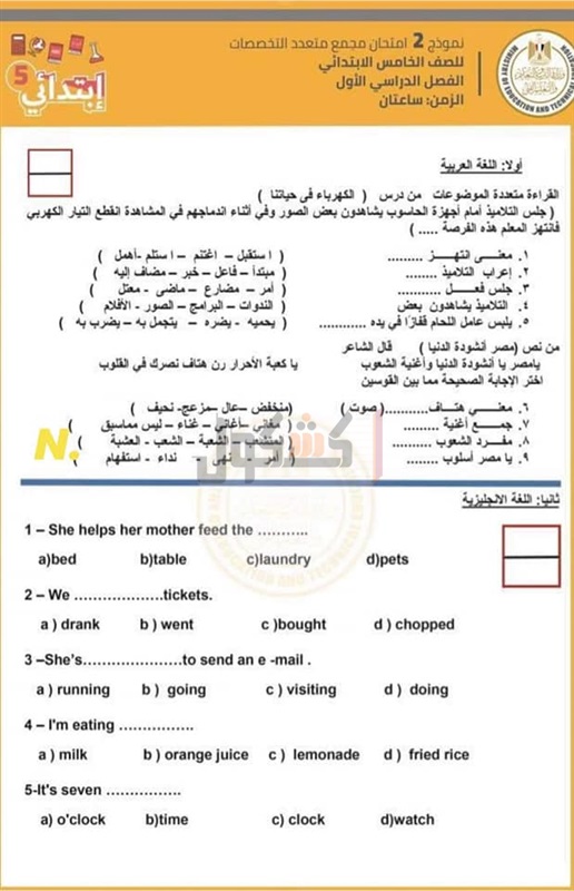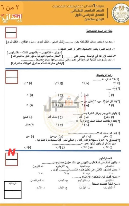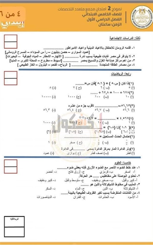 الامتحانات الاسترشادية لطلاب الصف الخامس الابتدائي، لتدريب الطلاب، على شكل