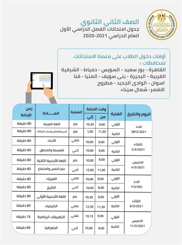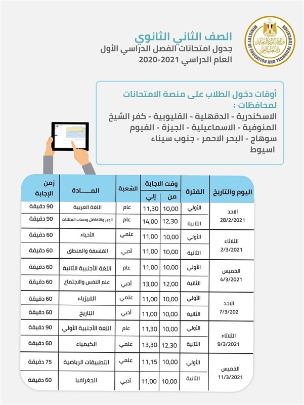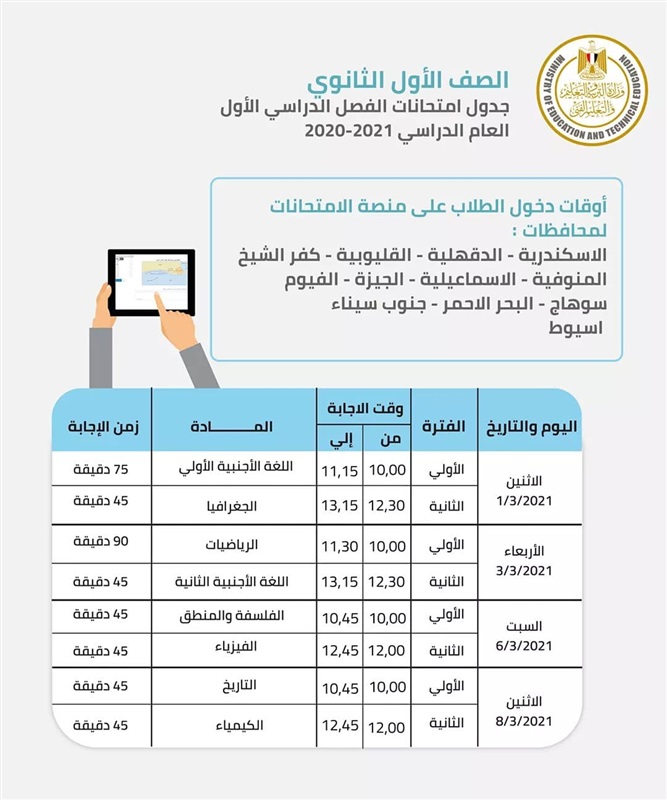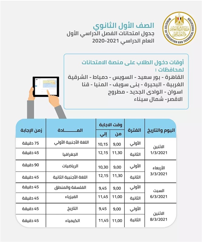 قررت وزارة التربية والتعليم والتعليم الفني إجراء الامتحانات الالكترونية للصفين الاول والثاني الثانوي بتعديل طفيف في المواعيد يضمن تخفيف الأحمال على شبكات الاتصالات وعليه فإن الطلاب في المحافظات المبينة سوف يستكملون الامتحانات حسب المحافظة.
