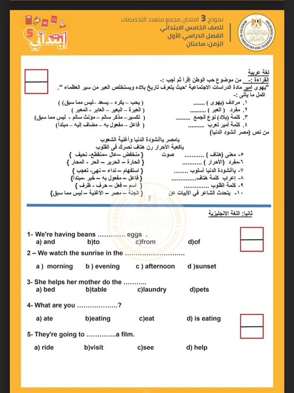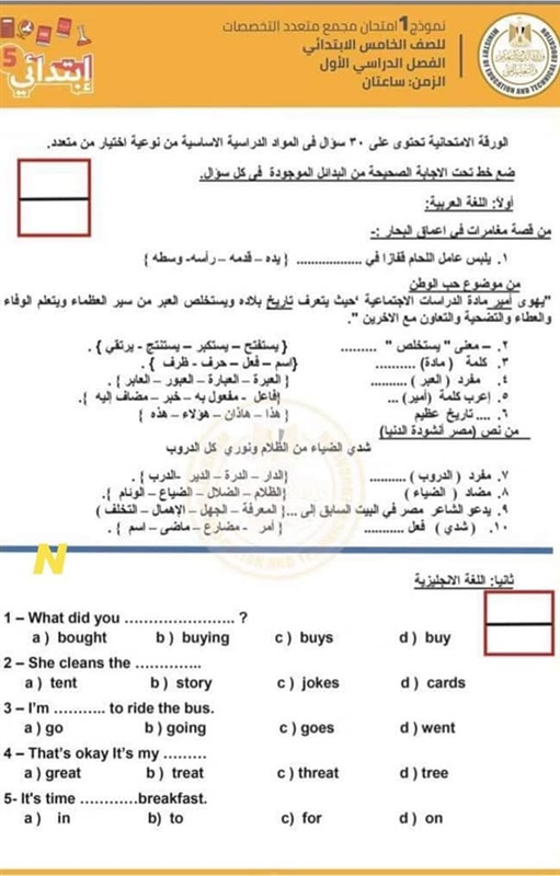 وزارة التربية والتعليم والتعليم الفني، نماذج الامتحانات الاسترشادية لطلاب الصف الخامس