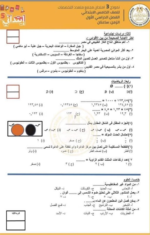 نماذج امتحانات الصف الخامس الابتدائى الترم الأول 2021