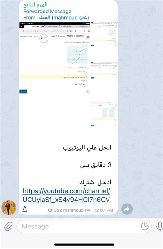 تداول عدد من طلاب الصف الثاني الثانوي، صورًا لإجابات الامتحان الإلكتروني لمادة الجبر والتفاضل وحساب المثلثات، عبر موقع التواصل الاجتماعي" التليجرام"، الذي يؤدية الطلاب حاليا داخل اللجان الامتحانية بمدارس الجمهورية.