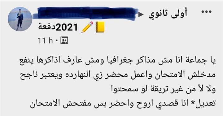 لمنشور طالب علي أحد مجموعات دفعة 2021، قال خلاله " يا جماعة أنا مش مذاكر