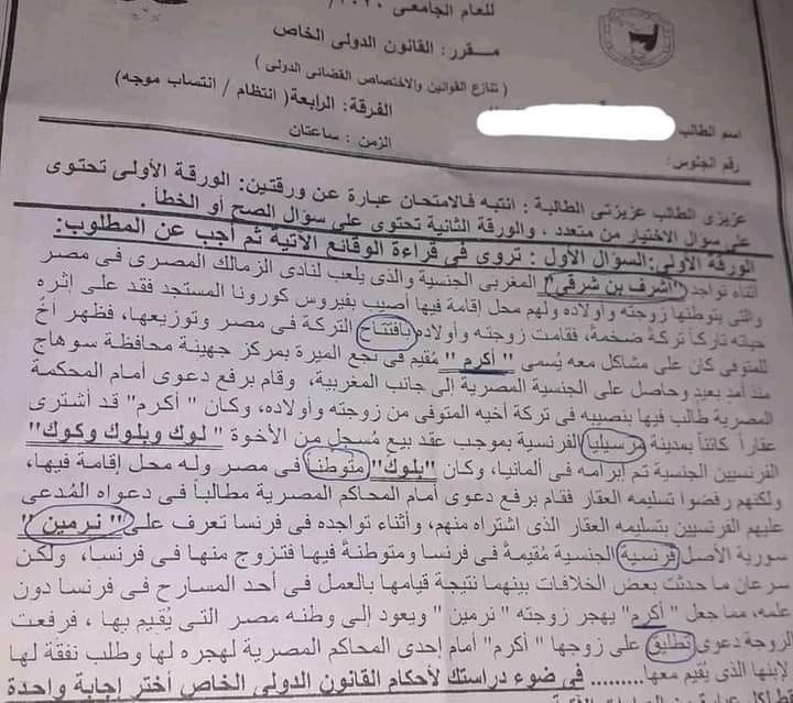 وكان أثار سؤال في امتحان مادة القانون الدولى للفرقة الرابعة بكلية الحقوق بجامعة سوهاج غضب جماهير نادى الزمالك بعدما افترض أستاذ المادة في سؤاله الأول من الإمتحان وفاة اللاعب المغربي ومهاجم نادى الزمالك أشرف بن شرقى بفيروس كورونا المستجد أثناء تواجده بمصر، وظهور مشاكل بين زوجته وأولاده وشقيق له مصري الجنسية يقيم بمركز جهينة بسوهاج، على تركته الضخمة التي تركها انتهت بدعاوى قضائية أمام إحدى المحاكم المصرية.