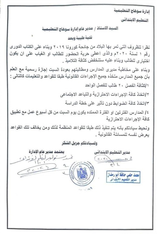 وجهت ادارة سوهاج التعليمية؛ عدة تعليمات بشأن الدراسة في الفصل الدراسي الثاني للعام الدراسي الحالي 2020/2021؛ نظرا للظروف التي تمر بها البلاد من جائحة كورونا كوفيد 19/20 وبناءا على الكتاب الدوري رقم 1 الذي أعطي حرية الحضور أو الغياب للطالب ستخفض كثافة التلاميذ.