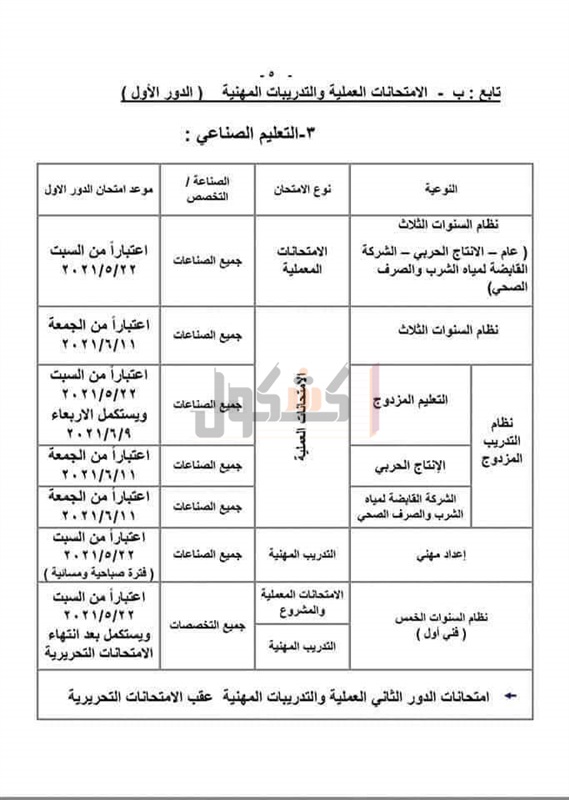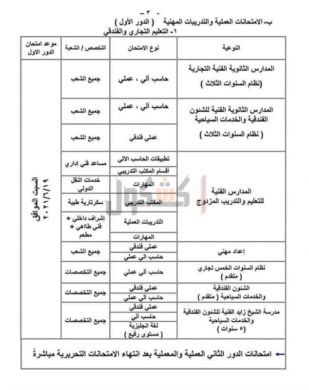 حيث تعقد امتحانات دبلوم المدارس الثانوية الفنية التجارية والثانوية الفنية الفندقية والثانوية الصناعية؛ إلي جانب الثانوية الفنية الزراعية ومدارس الثانوية الفنية للتعليم المزدوج بداية من يوم السبت 29 مايو 2021.