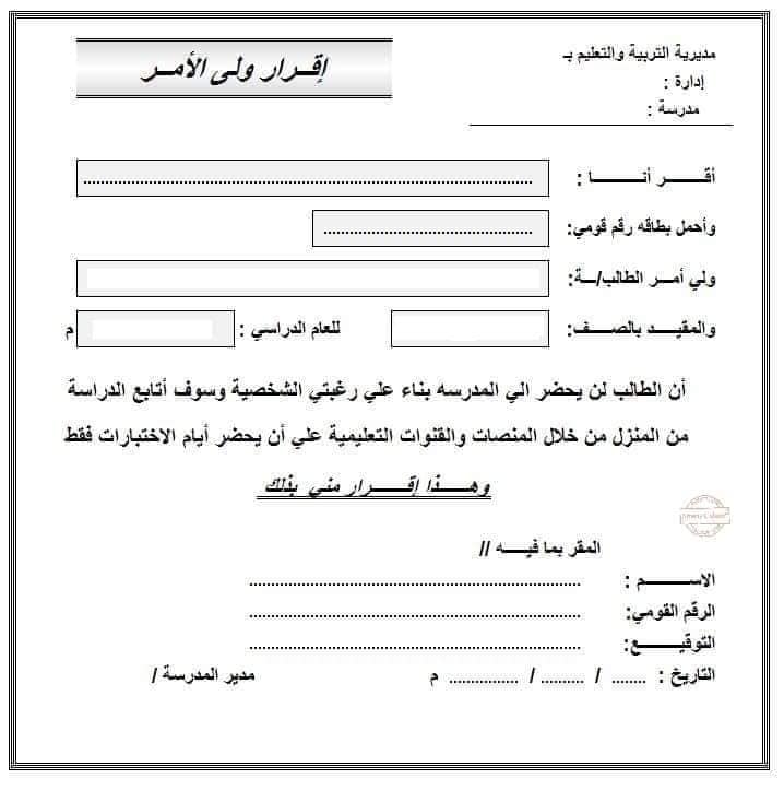 ننشر صورة إقرار ولي الأمر في حالة رغبته فى عدم حضور الطالب إلى المدرسة بالفصل الدراسي الثاني.