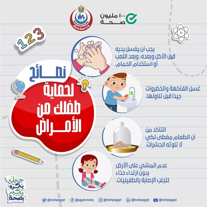 وأشارت "الصحة" عبر صفحتها الرسمية على موقع التواصل الاجتماعي "فيس بوك"، إلى أن هناك 4 نصائح لحماية طفلك من الأمراض، وهم: