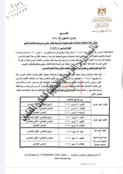 ننشر صور الكتاب الدوري، الذي أصدرته وزارة التربية والتعليم والتعليم الفني، المنظم لطرق تقييم الطلاب في الفصل الدراسي الثاني للصفوف من الرابع الابتدائي حتى الثاني الإعدادي في المدارس الرسمية والخاصة والدولي، على أن تُعقد ثلاثة اختبارات ورقية مجمعة في شهر مارس وأبريل ومايو بنفس الضوابط الخاصة بامتحانات صفوف النقل للصفوف من الرابع الابتدائي حتى الثاني الإعدادي بديلًا عن امتحانات الفصل الدراسي الثاني.