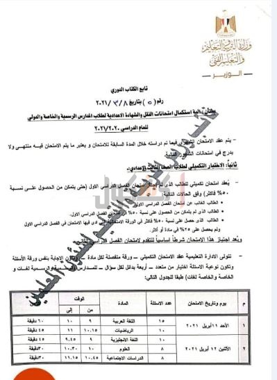 وأعلنت الوزارة، مواعيد الامتحان التكميلي لطلاب الشهادة
