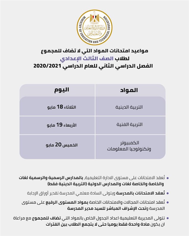قررت وزارة التربية والتعليم والتعليم الفني، عقد امتحانات مواد (التربية الدينية، التربية الفنية، الكمبيوتر وتكنولوجيا المعلومات) لطلاب الصف الثالث الإعدادي على مستوى الإدارة التعليمية، بالمدارس الرسمية والرسمية لغات والخاصة والخاصة لغات والمدارس الدولية (التربية الدينية فقط) .