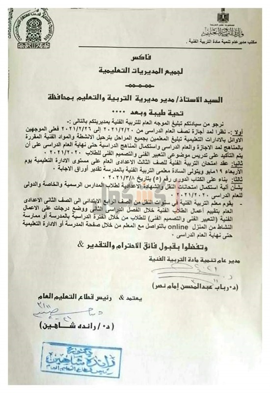 وجه مكتب تنمية التربية الفنية بوزارة التربية والتعليم والتعليم الفني خطاب رسمي للمديريات التعليمية؛ بضرورة تبليغ الموجه العام للتربية الفنية بالآتي: