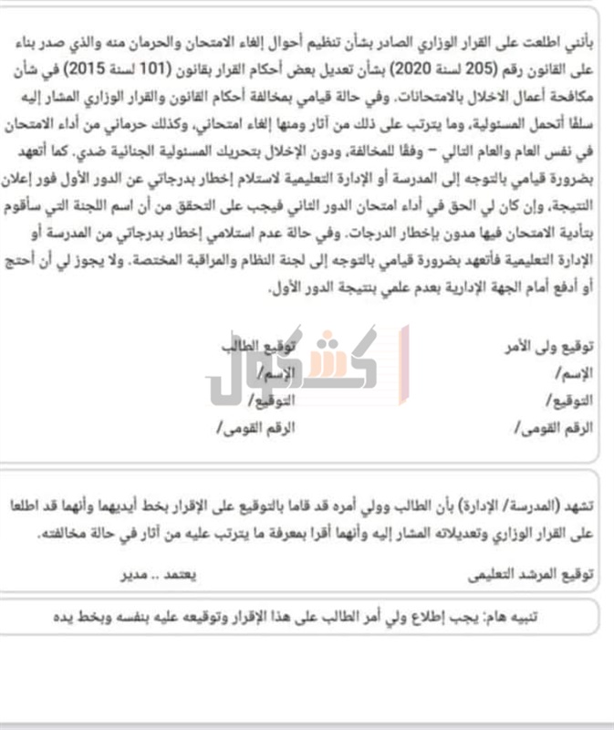 ننشر صورة إقرار ولي الأمر والطالب بشأن مكافحة الغش والحصول على النتيجة بالثانوية العامة