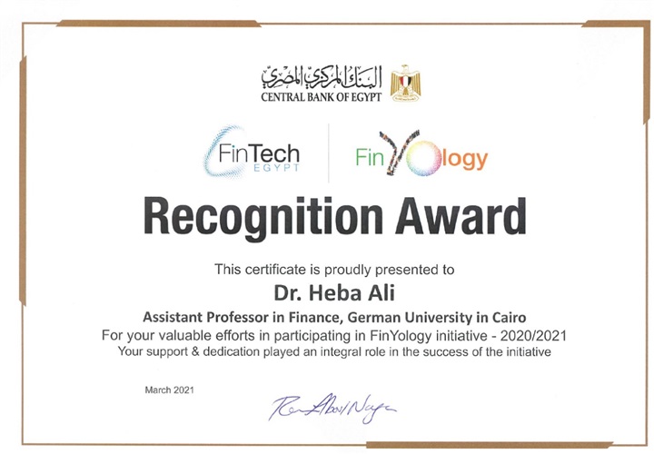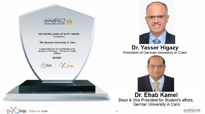 شارك مجموعة من طلبة قسمي التمويل ، و الأبتكار و ريادة الأعمال بكلية تكنولوجيا الأدارة بالجامعة الألمانية بالقاهرة في مبادرة FinYology-FinTech for Youth التي أطلقها البنك المركزي المصري وتسعى لنشر الوعي و تنمية الابتكار في مجالات وتطبيقات التكنولوجيا المالية وتتواكب مع جهود الدولة المبذولة لتحقيق أهداف الشمول المالي والتحول الرقمي ، وذلك بالتعاون مع عدد من البنوك - شملت الأهلي المصري، بنك مصر، الإمارات دبي الوطني، قطر الوطني، الإسكندرية – و شارك فيها عدد من الجامعات – منها الأمريكية بالقاهرة ، الجيزة الجديدة ، الأكاديمية العربية للعلوم والتكنولوجيا والنقل البحري إضافة للجامعة الألمانية بالقاهرة ، حيث بدأت المبادرة بمسابقة تنافسية شارك فيها عدد206 طالب وطالبة بالسنة الدراسية الرابعة بقسمى التمويل ، و الابتكار وريادة الاعمال ، وتم تكليفهم بإعداد مشروعات بحثية حول مجالات و تطبيقات التكنولوجيا المالية ، كما حوى برنامج المبادرة تقديم محاضرة متخصصة جاءت فى إطار نشر الوعى بمفهوم التكنولوجيا المالية من جانب الدكتورة رشا نجم - وكيل المحافظ المساعد لقطاع نظم الدفع وتكنولوجيا المعلومات بالبنك المركزى.