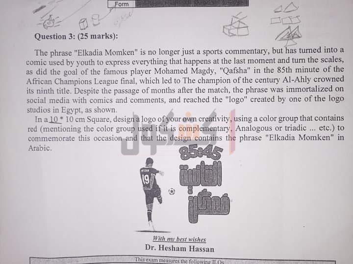 وجاء السؤال على النحو التالى، لم تعد عبارة "القاضية ممكن" مجرد تعليق رياضي، بل تحولت إلى مصطلح يستخدمه الشباب للتعبير عن كل ما يحدث في اللحظة الأخيرة وقلب الموازين، كما فعل هدف اللاعب الشهير محمد مجدي أفشة في الدقيقة 85 من نهائي دوري أبطال أفريقيا ما أدى إلى تتويج بطل القرن الأهلي بلقبه التاسع، وعلى الرغم من مرور شهور على المباراة، إلا أن العبارة خلدت على مواقع التواصل الاجتماعي بالرسوم الهزلية والتعليقات، ووصلت إلى الشعار الذي أنشأه أحد استوديوهات الشعارات في مصر، كما هو موضح في مربع 10×10سم، صمم شعارًا من إبداعك الخاص، باستخدام مجموعة ألوان، تحتوي على اللون الأحمر مع ذكر مجموعة اللون المستخدمة إذا كانت مكملة أو متشابهة أو ثلاثية، للاحتفال بهذه المناسبة، وأن يحتوي التصميم على عبارة (Elkadia Momken) بالعربية.