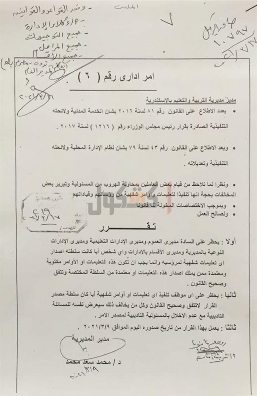 قررت مديرية التربية والتعليم والتعليم الفني في محافظة الإسكندرية؛ حظر مديرى العموم والادارات التعليمية ومديرى الإدارات النوعية بالمديرية ومديرى الأقسام اصدار أى تعليمات شفهية لمرؤسيه، مشددًا على ضرورة أن تكون هذة التعليمات أو الأوامر مكتوبة ومعتمدة ممن يملك إصدار هذه التعليمات ومعتمدة من السلطة المختصة تتفق وصحيح القانون.