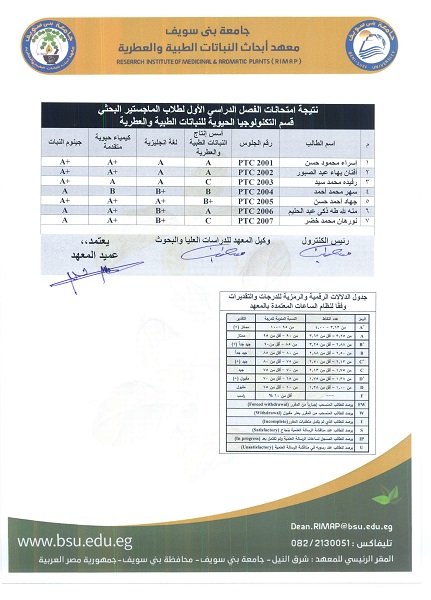أعلن الدكتور منصور حسن رئيس جامعة بنى سويف، اعتماد نتيجة امتحانات الفصل الدراسي الأول لبرامج الماجستير البحثي والماجستير المهني بجميع أقسام معهد أبحاث النباتات الطبية والعطرية للدفعة الأولى من طلاب الدراسات العليا بالمعهد.