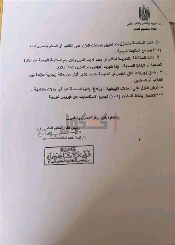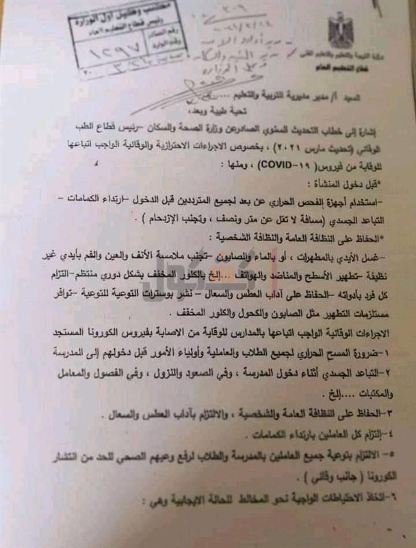 وجهت وزارة التربية والتعليم والتعليم الفني المديريات التعليمية؛ بشأن التحديث السنوى الصادر عن وزارة الصحة والسكان بخصوص الإجراءات الاحترازية والوقائية الواجب اتباعها للوقاية من كوفيد19 ومنها: