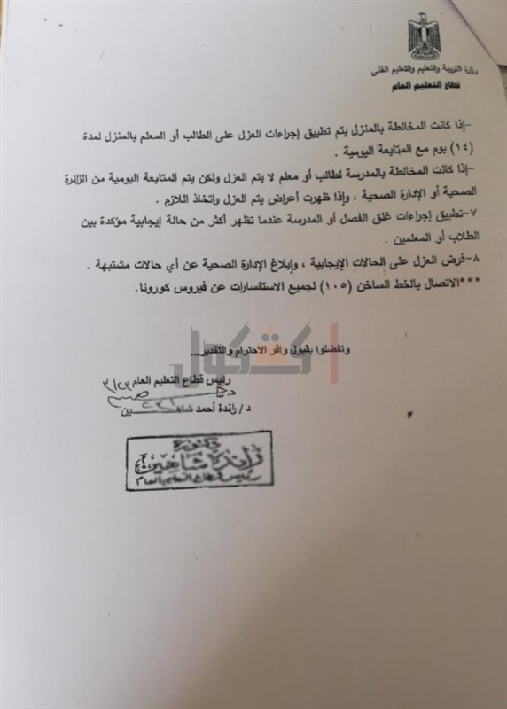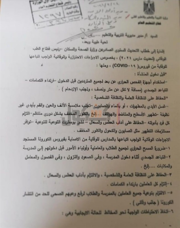رسمية لجميع المديريات التعليمية، بشأن الاجرءات الاحترازية الوقائية الواجب اتباعها