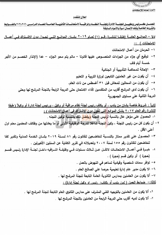 موانع الاشتراك في أعمال امتحانات الثانوية العامة 2021