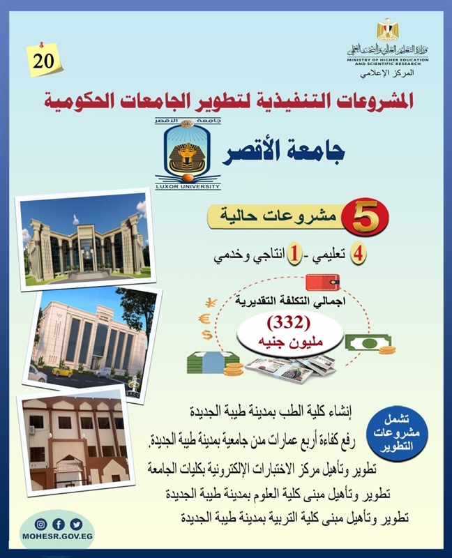 وأوضح التقرير، أن التكلفة الإجمالية للمشروعات الجاري تنفيذها في جامعة الأقصر تبلغ نحو (332) مليون جنيه.
