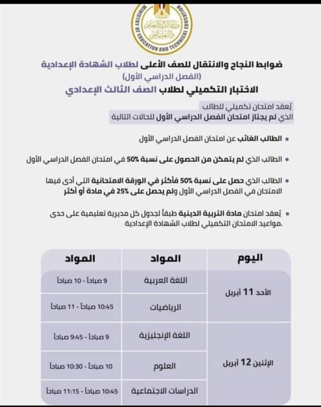 وحددت الوزارة مواعيد الامتحان التكميلي :