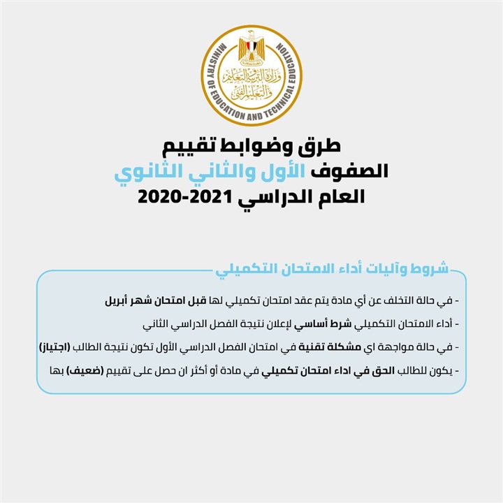 كانت قد أعلنت وزارة التربية والتعليم والتعليم الفني، عن طرق وضوابط التقييم لطلاب الصف الأول والثاني الثانوي للعام الدراسي 2021-2020.