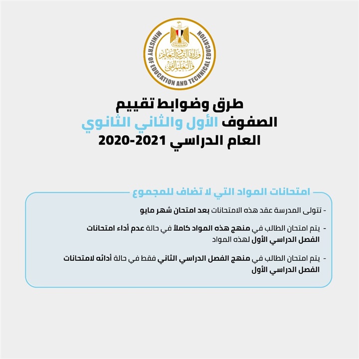 - امتحانات المواد التي لا تضاف للمجموع تتولى المدرسة عقدها وذلك بعد امتحانات شهر مايو على مستوى المدرسة وتحت إشراف الإدارة التعليمية، والطلاب الذين لم يسبق لهم أداء هذه الامتحانات قبل توقف الدراسة يتم امتحانهم في المنهج كاملاً، أما الطلاب الذين سبق لهم أداء هذه الامتحانات قبل توقف الدراسة يتم امتحانهم في منهج ومقرر الصف الفصل الدراسي الثاني فقط.