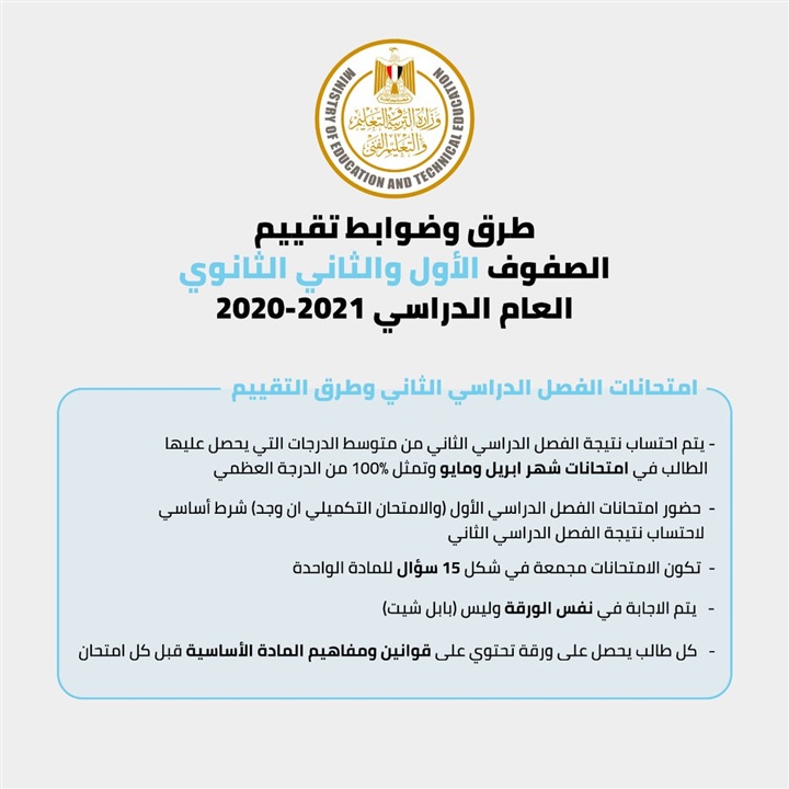وأوضحت وزارة التربية والتعليم، بأن امتحانات الصفين الأول والثاني الثانوي، تُعقد الامتحانات مجمعة (في شهر أبريل وشهر مايو) وبنفس عدد الأسئلة المقررة لكل مادة والواردة في الكتاب الدوري رقم 9 بتاريخ 2021/3/24 بنوعية اختيار من متعدد على أن تكون الاجابة بنفس ورقة الأسئلة (وليس بابل شيت) ويزود كل طالب بورقة بها المفاهيم والقوانين الأساسية للمادة بديلاً عن اصطحاب الكتاب المدرسي.