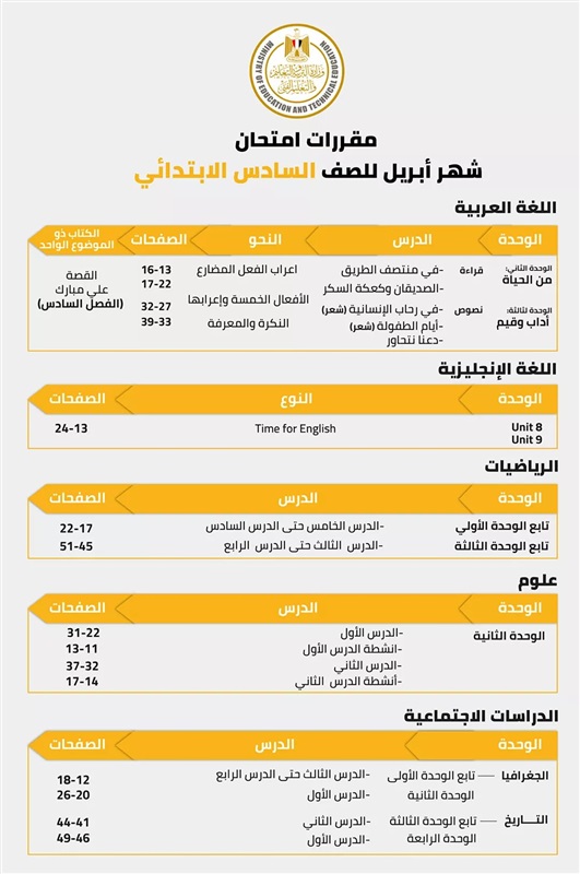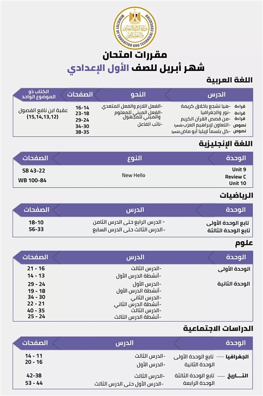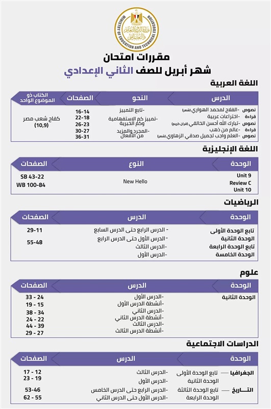 بدأت وزارة التربية والتعليم والتعليم الفني، في الاستعداد لامتحانات شهر ابريل لطلاب سنوات النقل، حيث اتاحت التعرف على مقررات ومناهج امتحان شهر أبريل لجميع الصفوف من الصف الرابع الابتدائي وحتى الصف الثاني الإعدادي من خلال الجداول المرفقة.