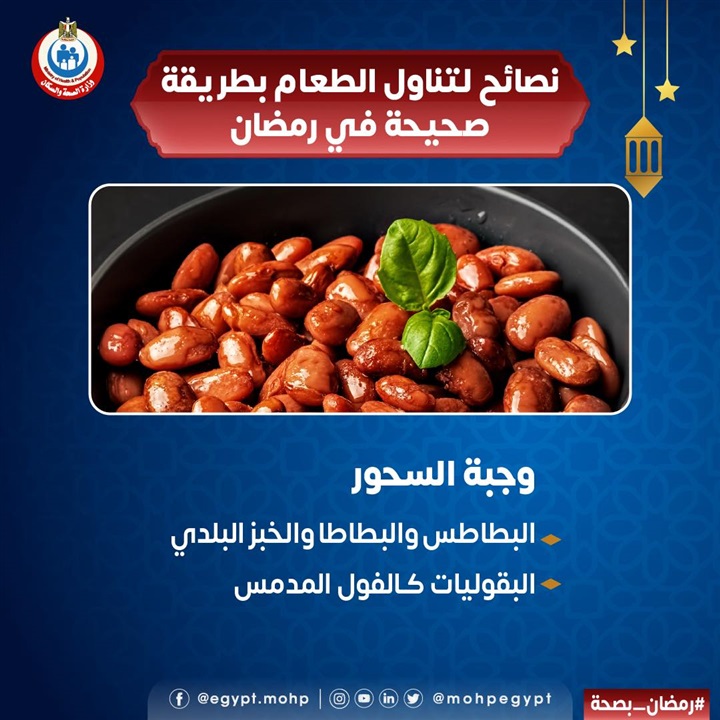 قدمت وزارة الصحة والسكان، نصائح للمواطنين تتزامنًا مع أول أيام شهر رمضان المبارك، لتناول الطعام بطريقة صحية في رمضان.