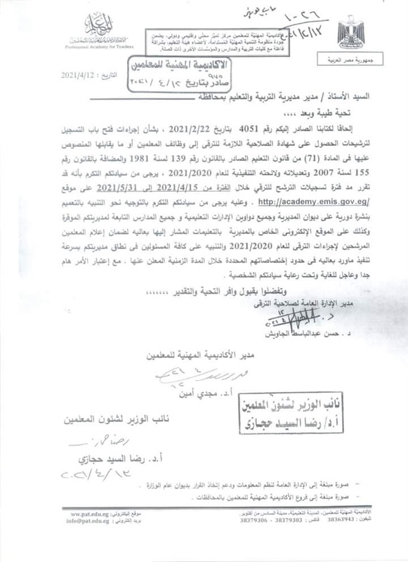 قررت وزارة التربية والتعليم والتعليم الفني، مد فترة تسجيلات الترشح للترقي خلال الفترة من 15 ابريل الجاري حتى نهاية مايو المقبل 2021 على موقع الأكاديمية المهنية للمعلمين :