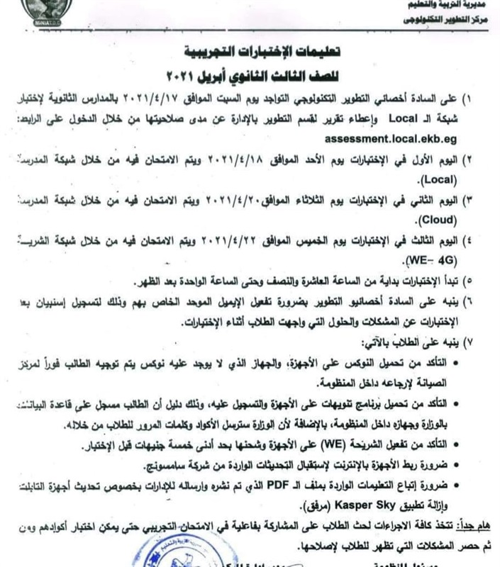 ۱) على السادة أخصائي التطوير التكنولوجي التواجد يوم السبت الموافق ۲۰۲۱/۹/۱۷ بالمدارس الثانوية لإختبار شبكة ال Local وإعطاء تقرير لقسم التطوير بالإدارة عن مدى صلاحيتها من خلال الدخول على الرابط:assessment.local.ekb.eg