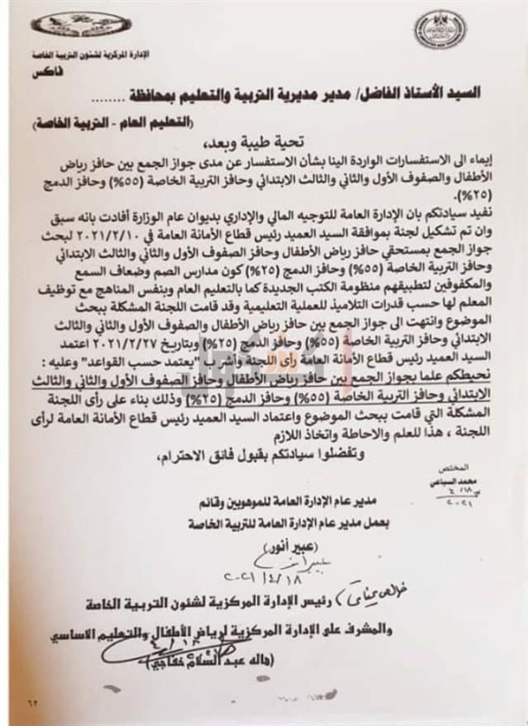 حيث أوضحت أنه إيماءًا إلى الاستفسارات الواردة عن مدى جواز الجمع بين حافز رياض الأطفال والصفوف الأول والثاني والثالث الابتدائي وحافز التربية الخاصة 55% وحافز الدمج 25%، فقد سبق وتم تشكيل لجنة لبحث الموضوع.