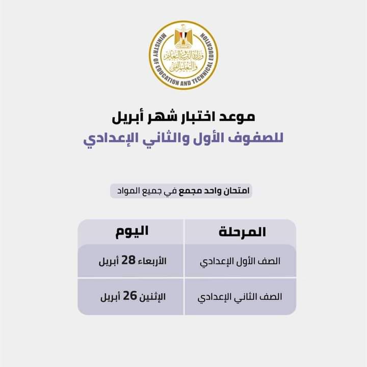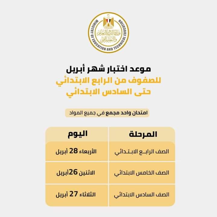 أعادت وزارة التربية والتعليم والتعليم الفني، نشر جداول امتحانات شهر أبريل للصفوف من الرابع الابتدائي حتى الثاني الإعدادي وكذلك الأول والثاني الثانوي والتي سيتم عقدها الأسبوع القادم في أيام ٢٦، ٢٧، ٢٨ أبريل.