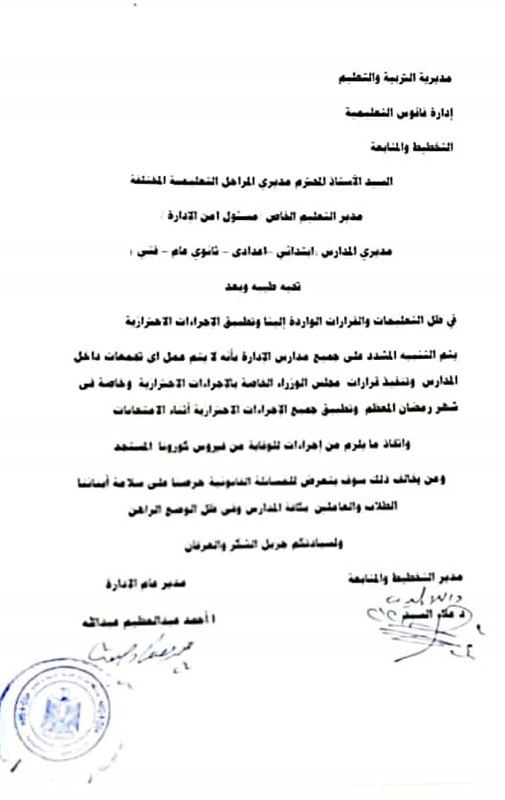 وجهت مديرية التربية والتعليم والتعليم الفني في محافظة الشرقية، بضرورة التنبيه المشدد على جميع المدارس بأنه لا يتم عمل أي تجمعات داخل المدارس.