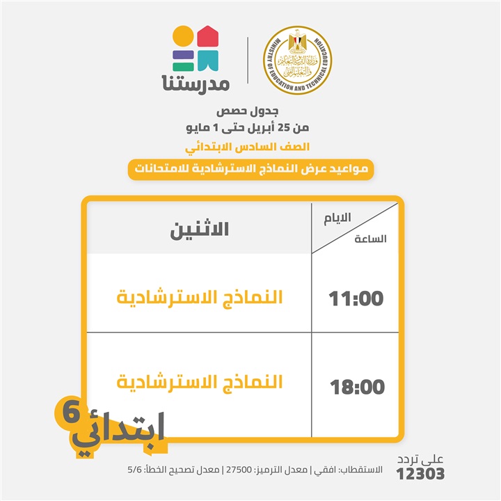أنه سوف يعرض نماذج استرشاديه للصف السادس الابتدائي الترم الثاني على قناة مدرستنا