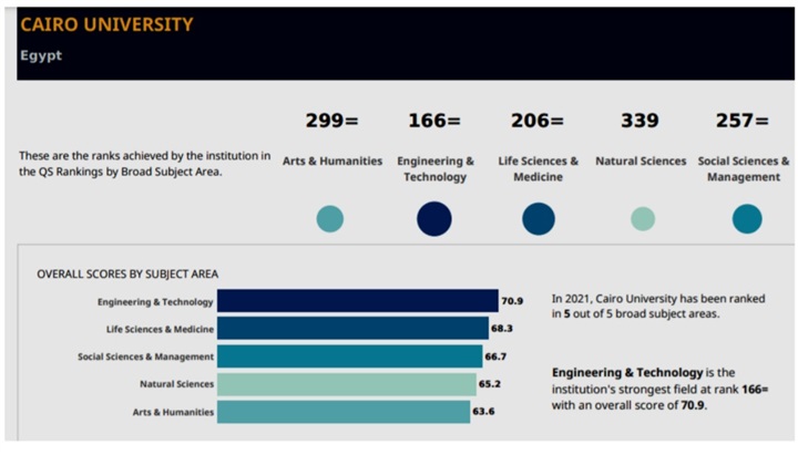 أعلن الدكتور محمد عثمان الخشت رئيس جامعة القاهرة، تحقيق قفزة غير مسبوقة في التصنيف الإنجليزي (QS) لأفضل الجامعات في مجالات العلوم الإنسانية والآداب والعلوم الإجتماعية والإدارية، حيث جاءت الجامعة ضمن أفضل 300 جامعة عالمية راقية، ومن بين 1% من الجامعات التي تم اختيارها وتصنيفها من بين أكثر من 30 ألف جامعة في العالم، بالإضافة إلى احتفاظها بصدارة الجامعات المصرية.