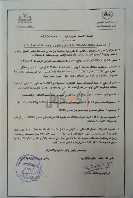 تعليم كفر الشيخ تحدد ضوابط صرف مكافأة الامتحانات.. "مستند"