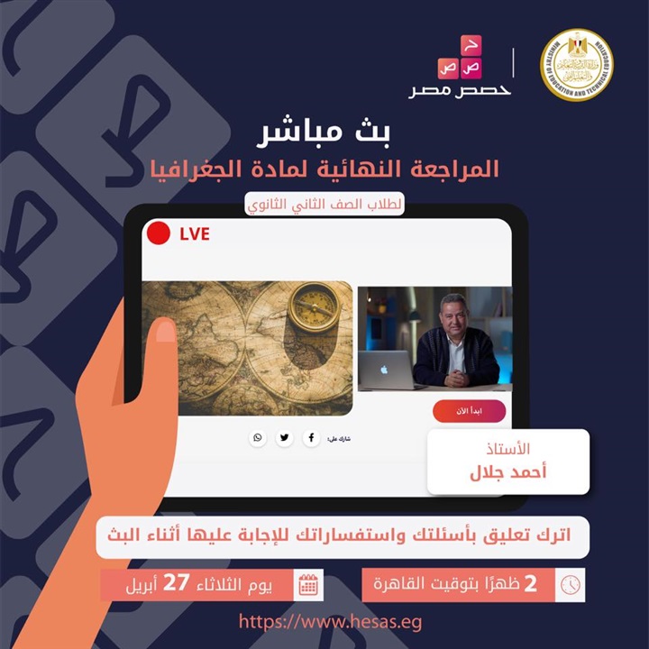 البث المباشر لمراجعة مادة الجغرافيا اليوم الثلاثاء ٢٧ أبريل الساعة ٢:٠٠ ظهرًا.