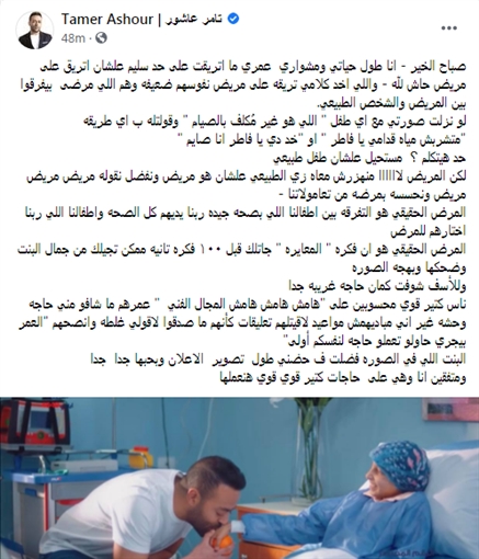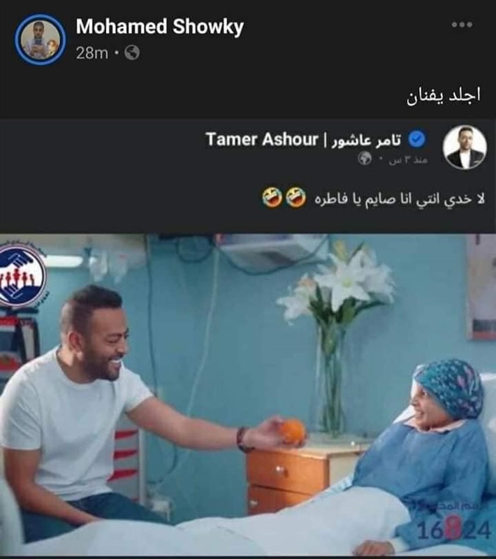 نشر الفنان تامر عاشور صورة له عبر صفحته الرسمية على موقع التواصل الاجتماعي "فيس بوك" من أحد مستشفيات أورام الأطفال برفقة طفلة مريضة، وعلق عليها مازحًا: "لا خدي انتي انا صايم يا فاطره.. بحبك".