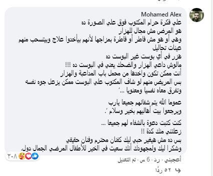 وتابع "لكن المريض لاااااا منهزرش معاه زي الطبيعي علشان هو مريض ونفضل نقوله مريض مريض مريض ونحسسه بمرضه من تعاملاتنا، المرض الحقيقي هو التفرقة بين أطفالنا اللي بصحة جيدة ربنا يديهم كل الصحة وأطفالنا اللي ربنا اختارهم للمرض، المرض الحقيقي هو أن فكرة " المعايرة" جاتلك قبل 100 فكرة تانية ممكن تجيلك من جمال البنت وضحكها وبهجة الصورة".