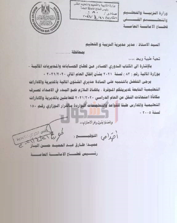جاء ذلك في إشارة للكتاب الدوري الصادر من قطاع الحسابات والمديريات المالية بوزارة المالية رقم 83 لسنة 2021 بشأن العام المالي 2020/2021.