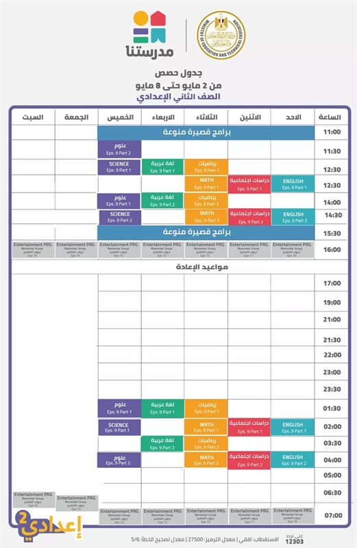 حيث نشرت الصفحة الرسمية لوزارة التربية والتعليم والتعليم الفني، جداول الأسبوع التاسع والعشرين في الفترة من يوم الأحد 2 مايو حتى السبت 8 مايو ٢٠٢١ لطلاب سنوات النقل من الصف الرابع الابتدائي حتى الثاني الإعدادي.