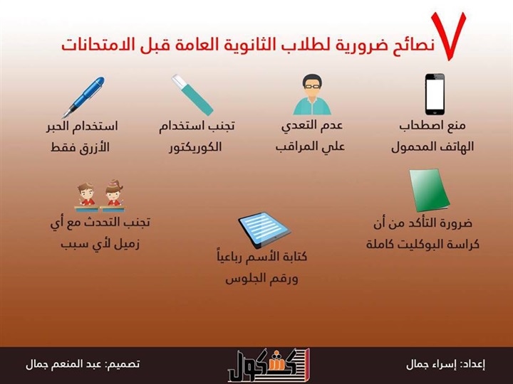 جراف انفوجراف: 7 نصائح ضرورية لطلاب الثانوية العامة قبل الامتحانات إسراء جمال السبت 02/يونيو/2018 - 10:47 م 6/2/2018 10:47:00 PM طباعة facebook twitter whats شارك